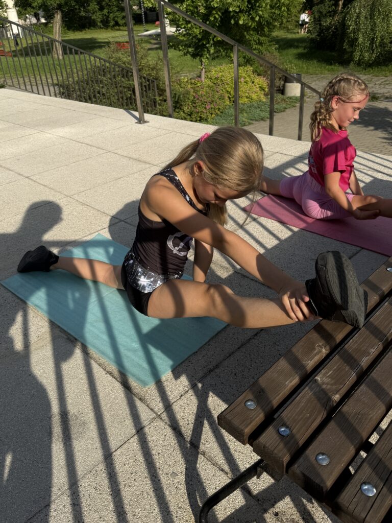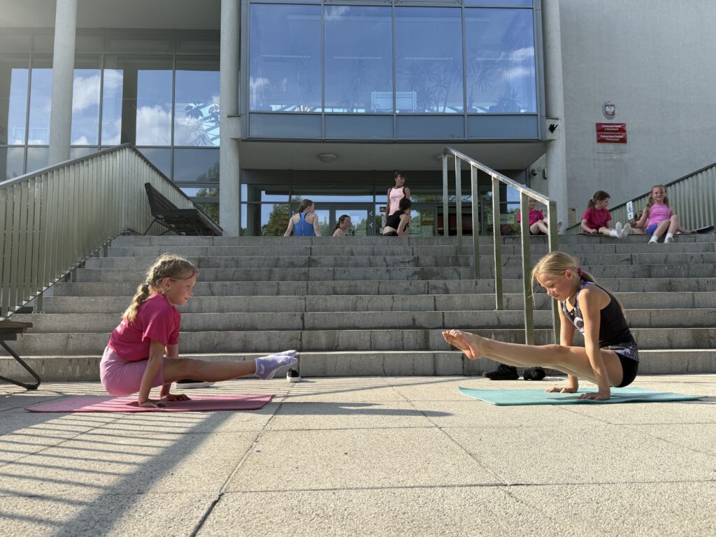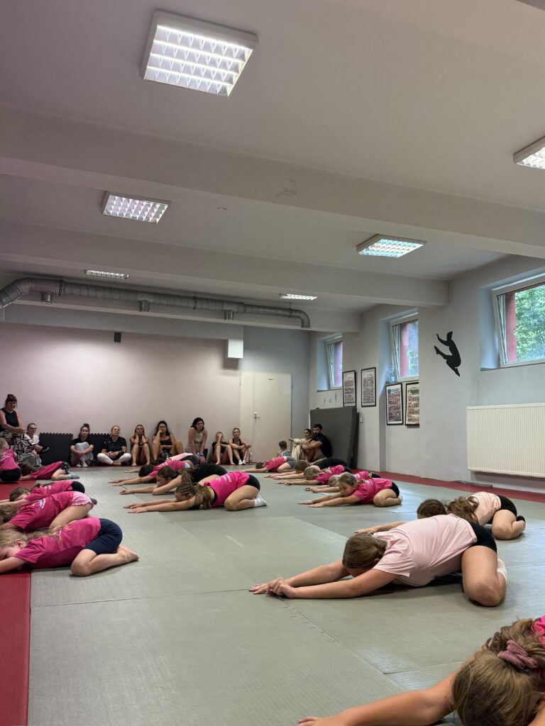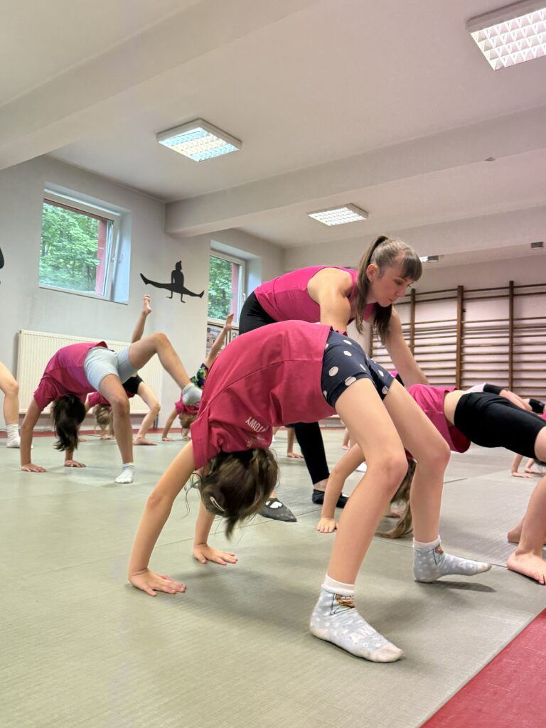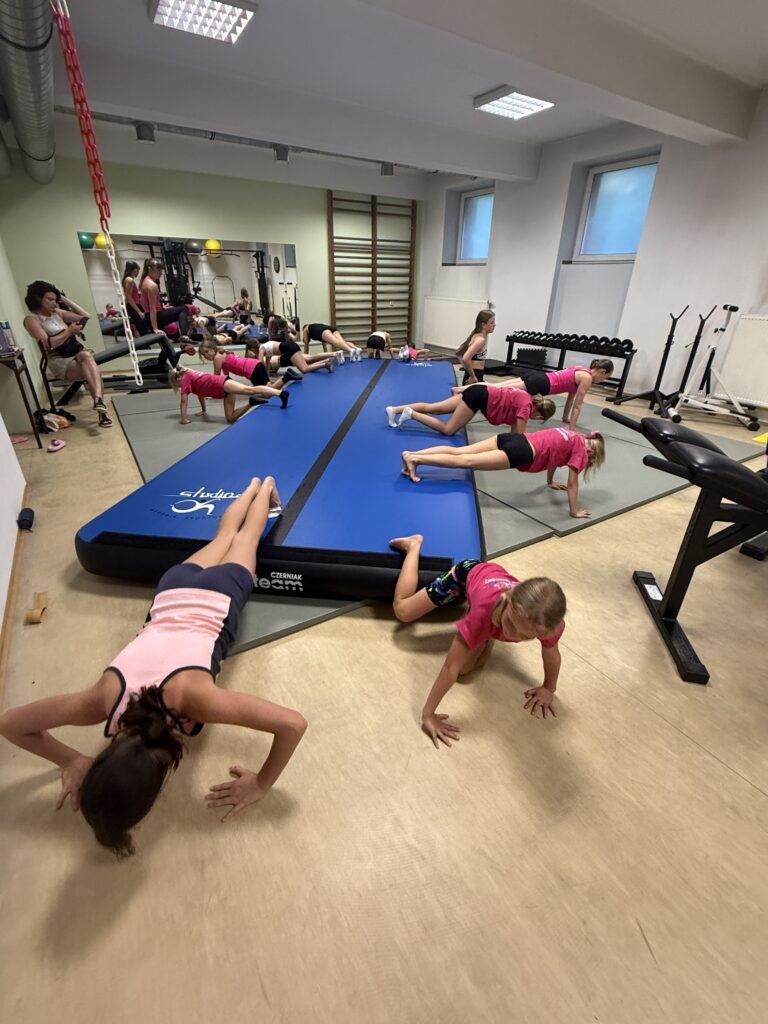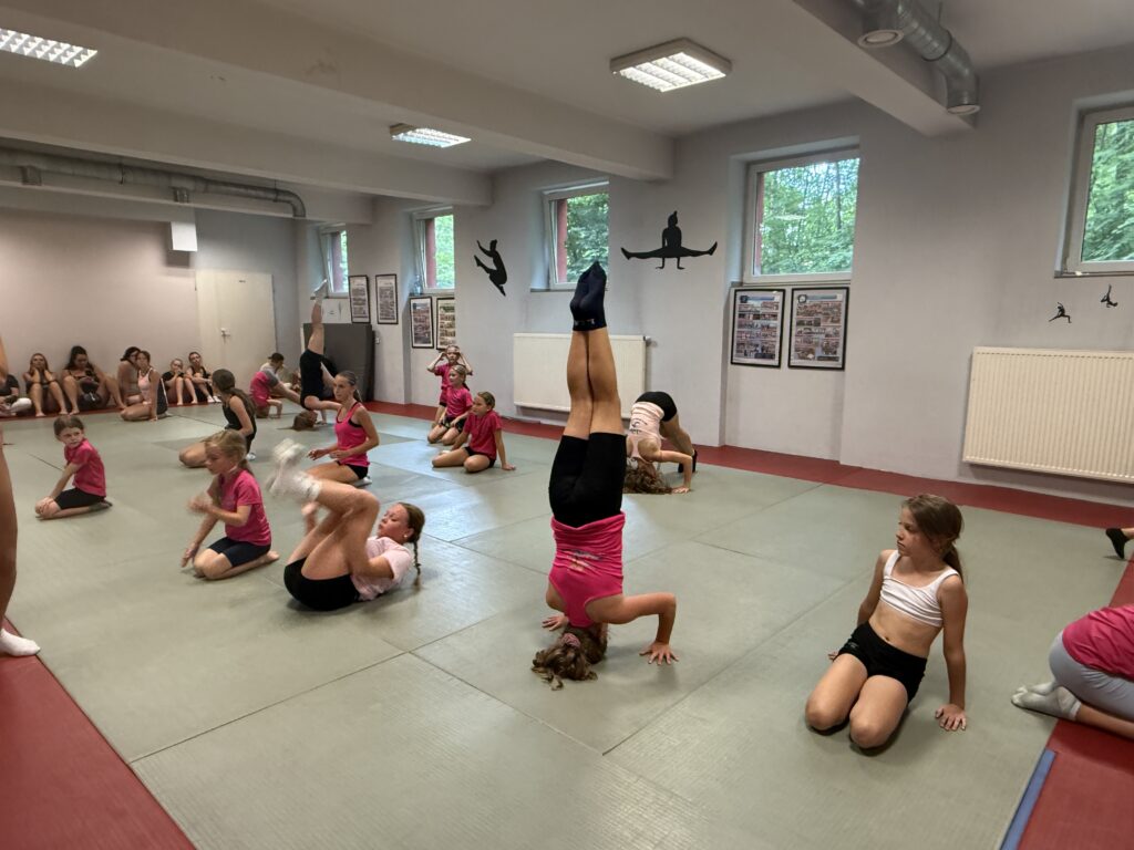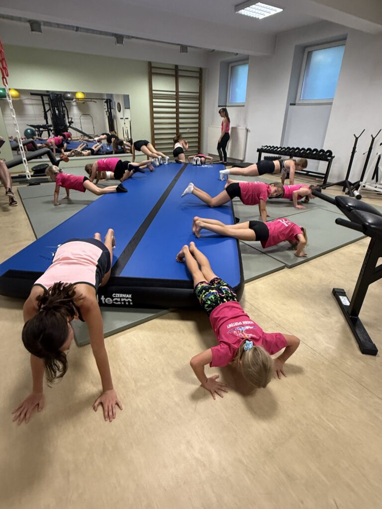 Nasze treningi są zawsze dostosowane do umiejętności grupy, jest ciężka praca z grupą zaawansowaną, ale też pełnia zabawy i ćwiczeń ogólnorozwojowych dla grupy początkującej. Dbamy o technikę wykonania elementów, o bezpieczeństwo podczas zajęć oraz dobrą zabawę. Kształtujemy całe ciało, wzmacniamy mięśnie i przy tym dobrze się bawimy. Podnosimy jakość wykonania ćwiczeń, uczymy nowych elementów, skaczemy salta, przerzuty, skoki aerobiku sportowego, stoimy na rękach i na głowie oraz tańczmy. Przerzuty bokiem, przewroty w przód i w tył to nasza codzienność, ale też przygotowujemy się do zawodów sportowych i reprezentujemy klub i Polskę na zawodach sportowych, mając niemałe sukcesy.